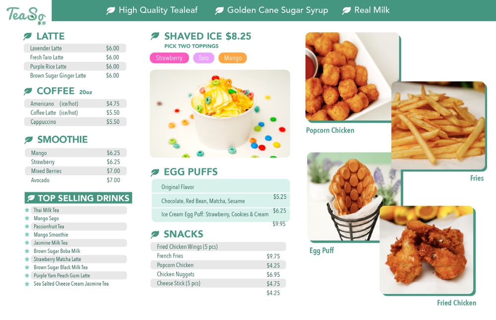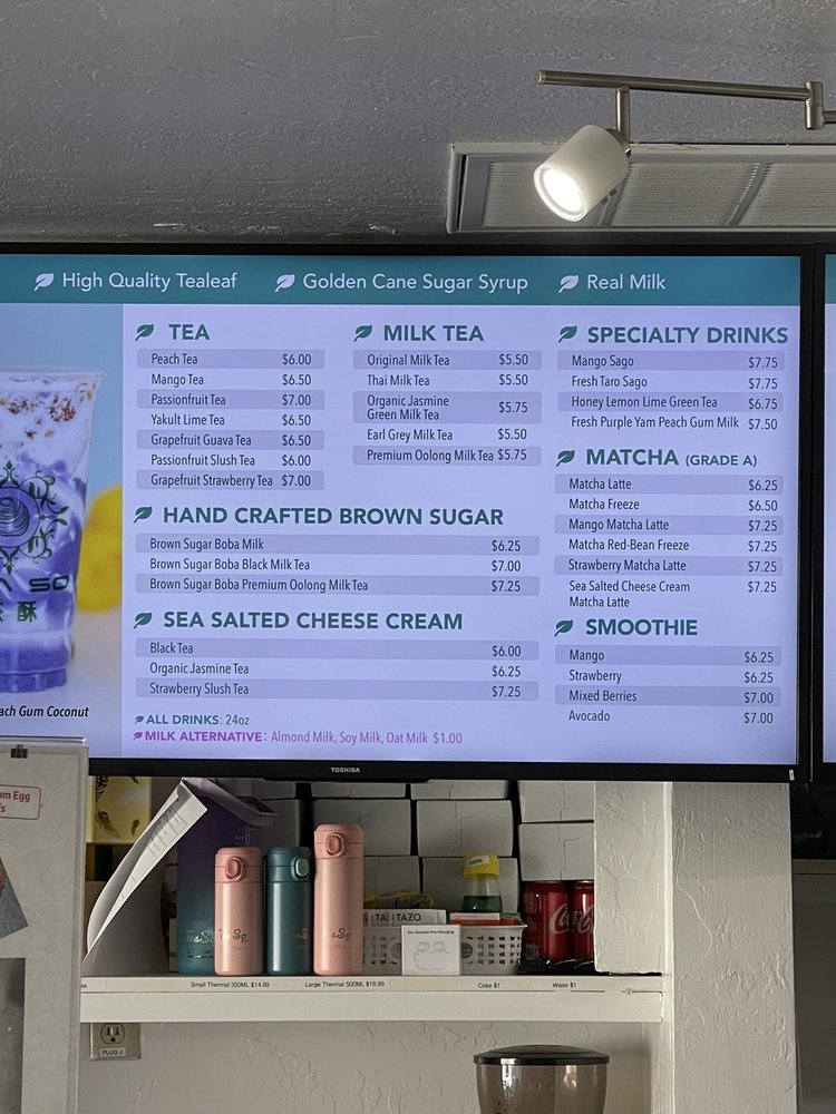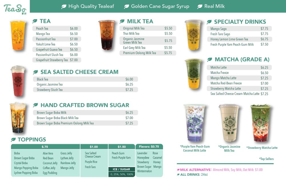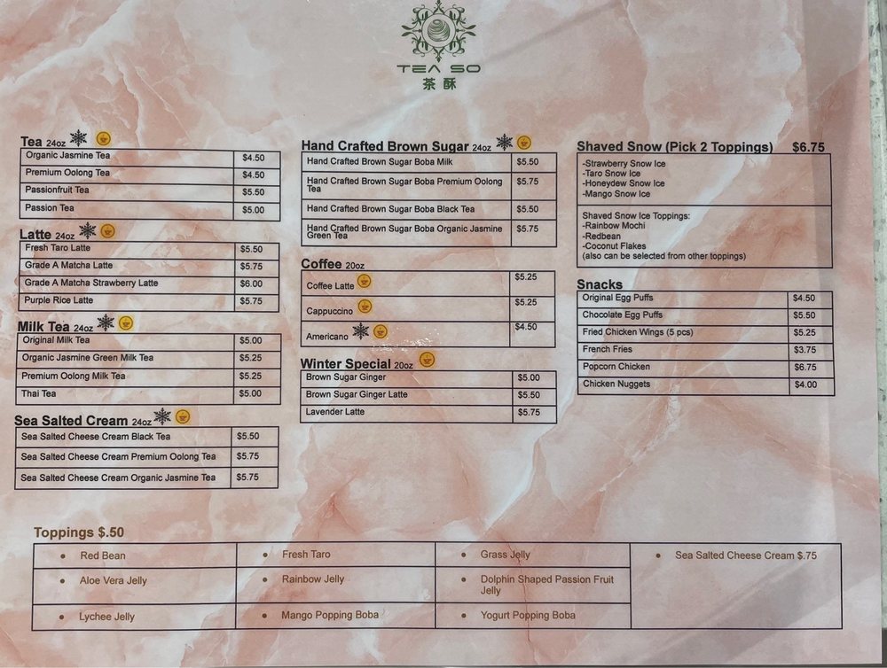 Tea So, located in Castro Valley, CA, offers a wide variety of desserts, bubble tea, coffee, and tea options. With amenities like delivery, takeout, wheelchair accessibility, and free Wi-Fi, Tea So provides a comfortable and convenient dining experience. Their menu features unique drinks such as Grapefruit Guava Tea, Passionfruit Slush Tea, and Fresh Taro Latte. Customers have praised the friendly service, clean store, and the opportunity to win prizes from claw machines. Although prices are on the higher side, the quality of the drinks and ingredients like fresh mangoes make it worth the cost. Overall, Tea So is a great spot to enjoy delicious and healthy beverages in a welcoming environment.